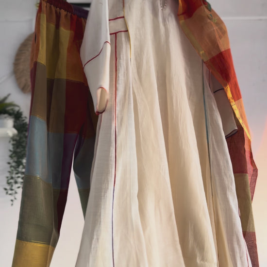 A whisper of elegance woven in tradition, the Loom Light set celebrates the quiet beauty of Narayanpet handloom in its purest form. Crafted in soft ivory cotton, the flared kurta flows effortlessly with delicate contrast borders that add just the right hint of detail. Paired with a thoughtfully woven dupatta in warm, earthy hues, the ensemble strikes a perfect balance between simplicity and soul.