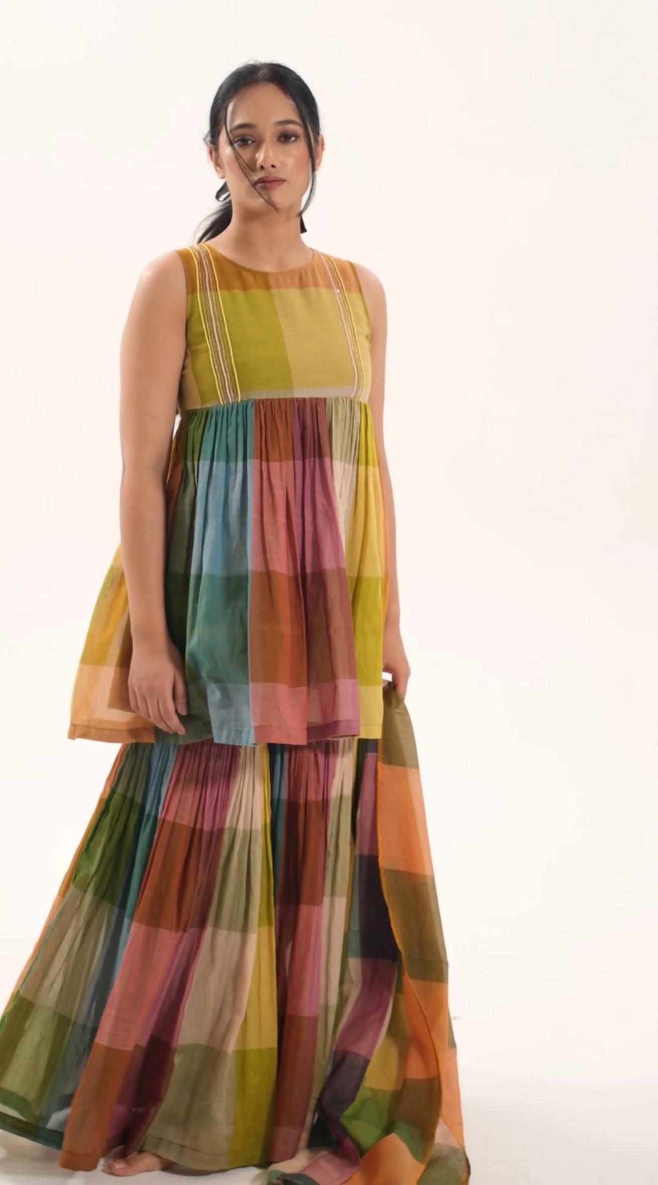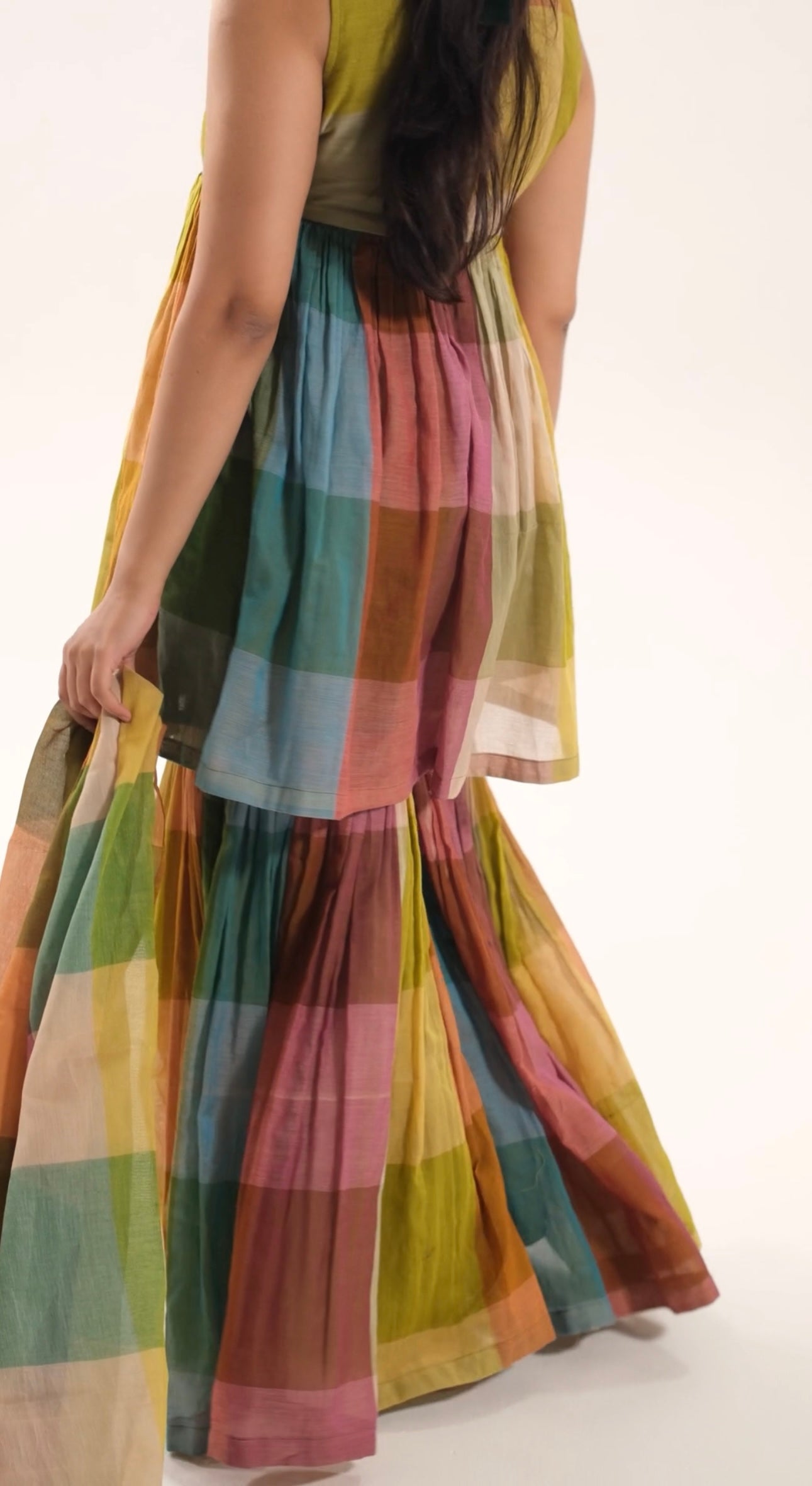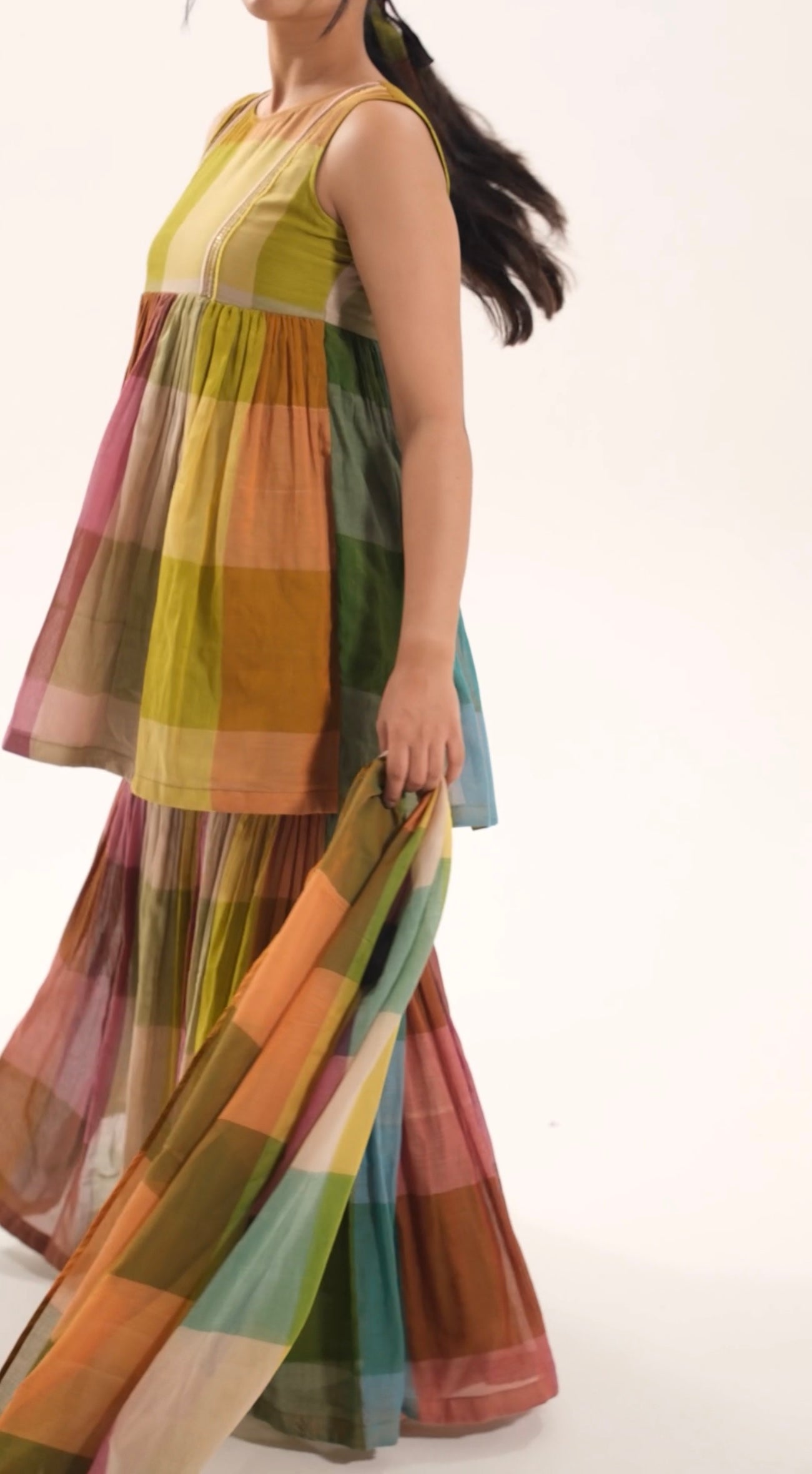 A tale told in threads — Colour Katha is our signature Narayanpet sharara set, woven with heritage and elevated with contemporary charm. This handwoven ensemble bursts with bold checks and rhythmic hues, capturing the spirit of Indian festivities in a free-spirited, modern silhouette. The soft cotton fabric is breathable yet structured, making it your go-to for celebrations, cultural soirees, and everything in between. Embroidered detailing adds depth to the look, while the flared sharara creates effortless movement. Rooted in Indian craftsmanship, styled for the modern muse — this is tradition, reimagined.