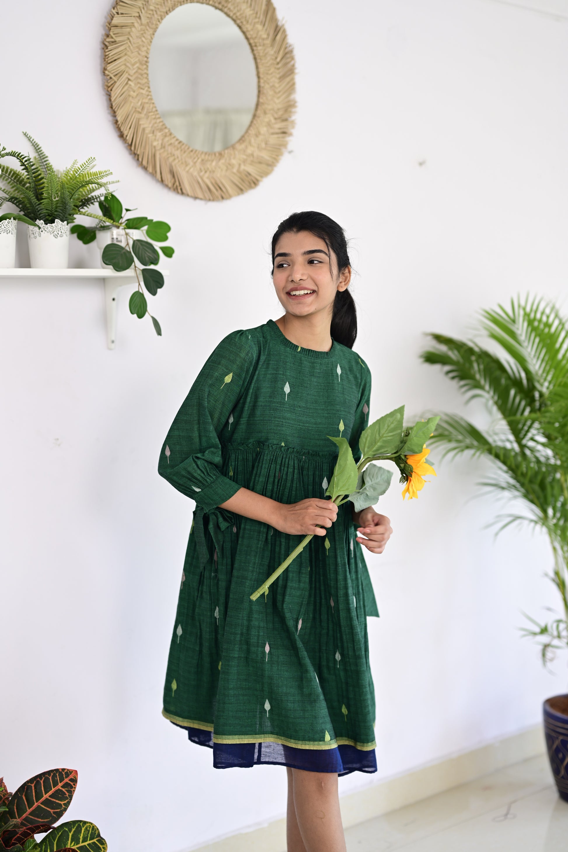 Elevate your ethnic style with our Green Jamdhani with Blue Narayanpet Dress, a stunning fusion of two iconic Indian weaves. The vibrant green Jamdhani fabric, adorned with delicate motifs, seamlessly pairs with the rich blue Narayanpet border featuring traditional zari accents. This handcrafted masterpiece exudes sophistication, making it ideal for festive gatherings, office wear, or casual celebrations.