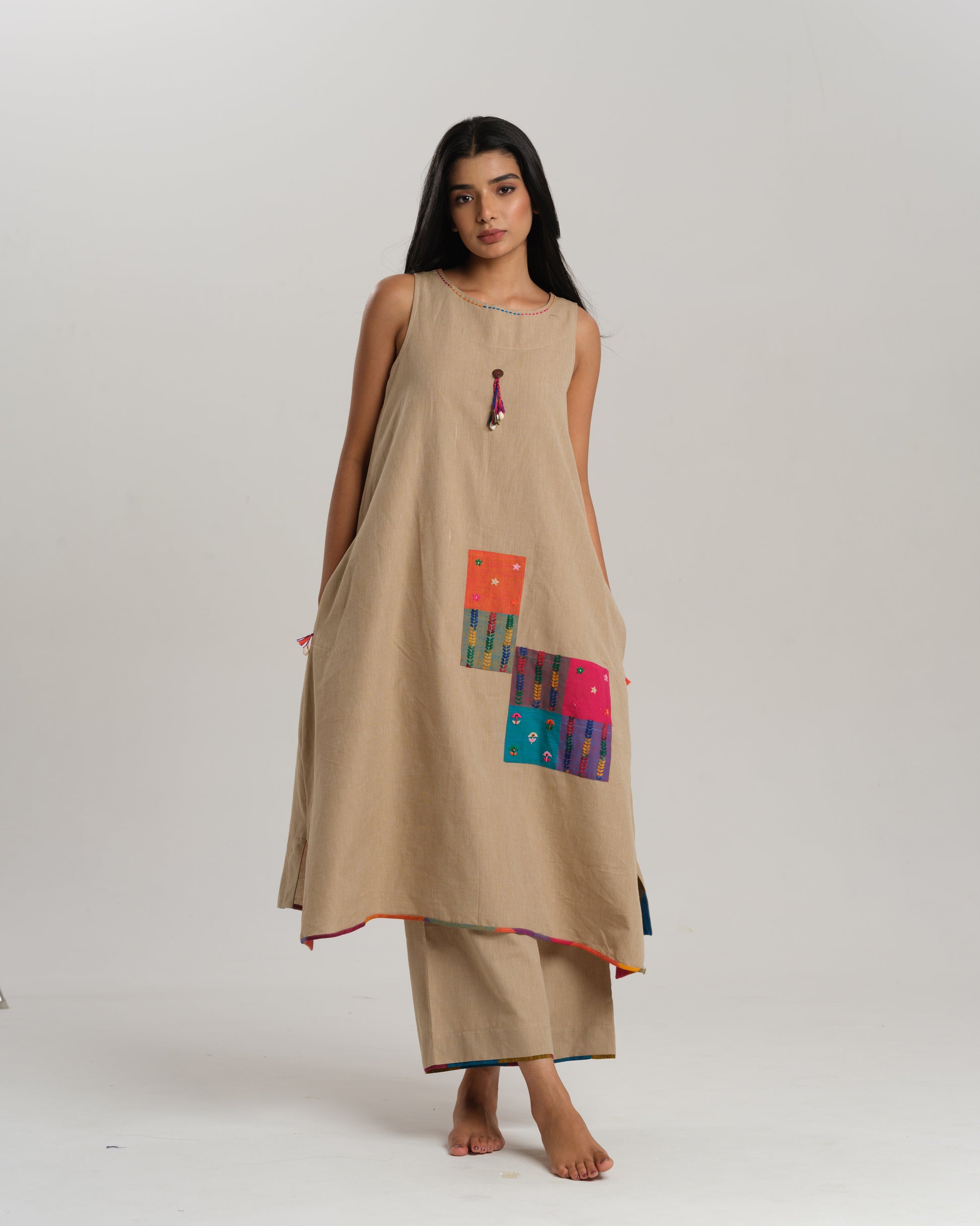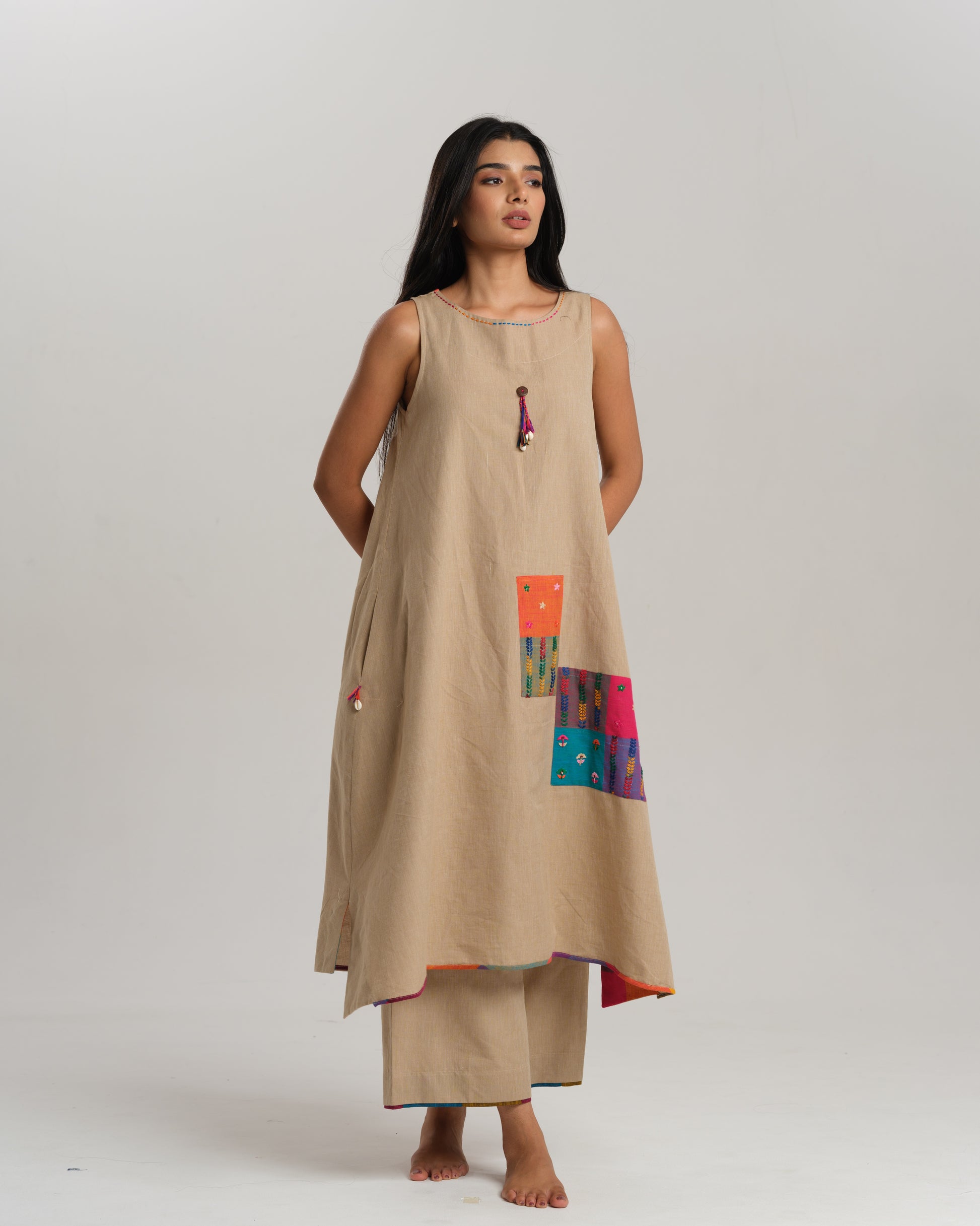 Step into a world of handcrafted harmony with Ikat Rhythm by Taram – a breezy, statement-making kurta set for women that blends earthy elegance with bold artistry. The sleeveless beige kurta is crafted in handwoven Ikat cotton and features vibrant patchwork detailing in multicolour South Indian checks, adding layers of texture, tradition, and playful geometry.