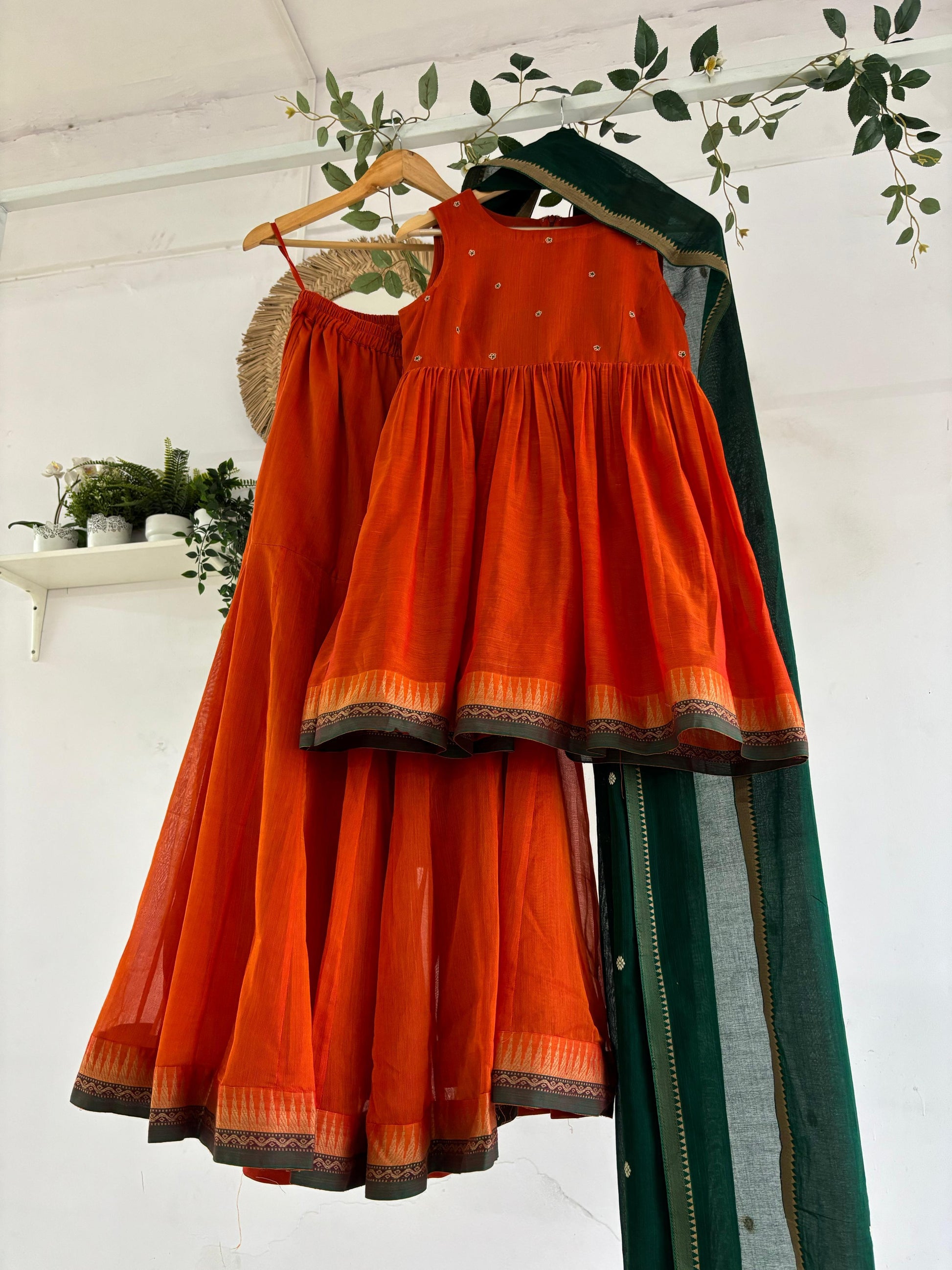Bright and festive, this Orange and Green Sharara Set is crafted from handwoven cotton. This orange sharara featuring a traditional woven border. The set is completed with a deep green dupatta edged with gold detailing, adding contrast and elegance. Perfect for festive occasions, family gatherings, or cultural events, this sharara set blends comfort with timeless traditional charm.