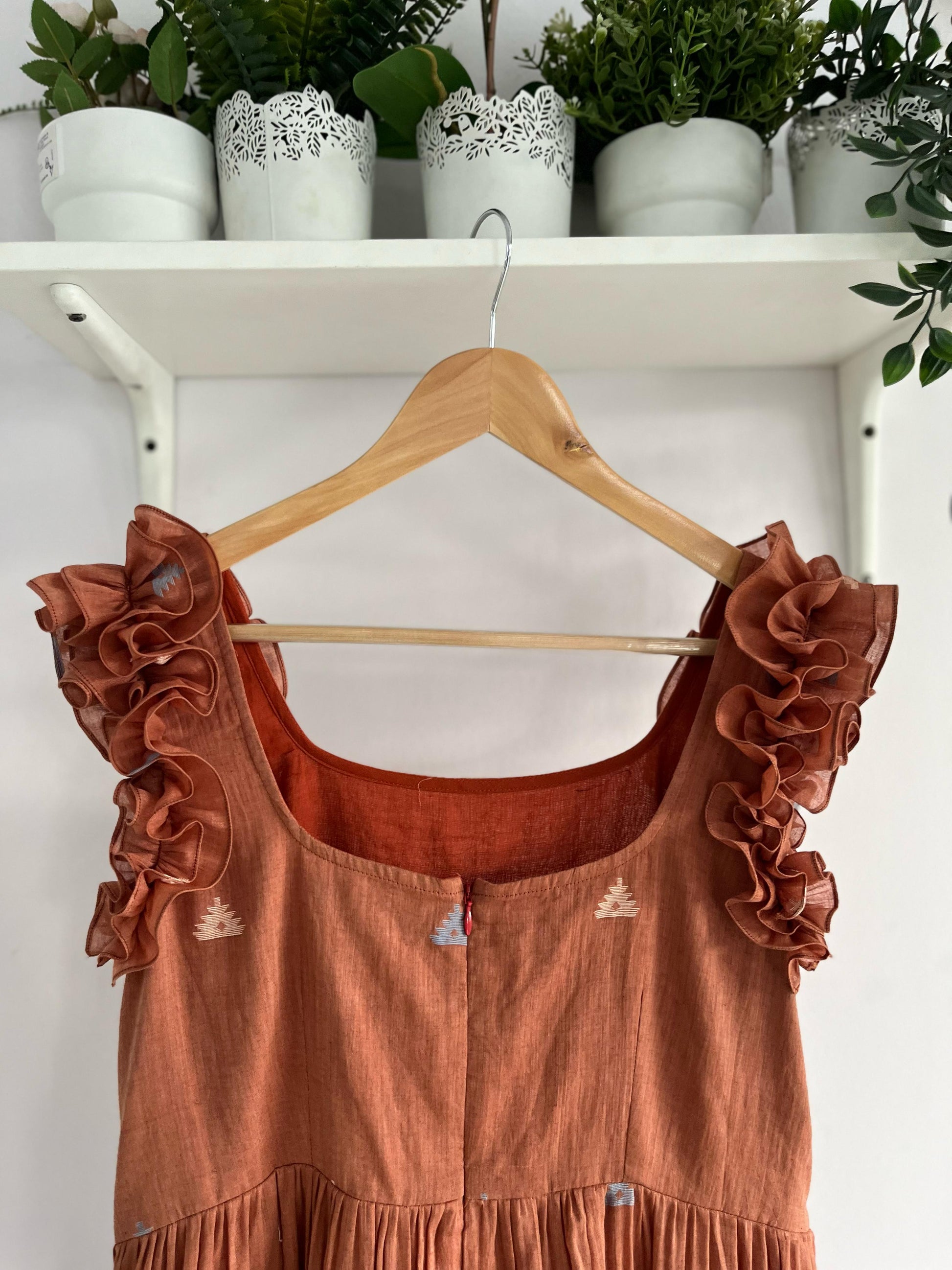 Step into timeless elegance with our Sand Dune: Dark Beige Multi-Tiered Jamdhani Dress. This exquisite piece showcases the intricate beauty of Jamdhani weaving, a traditional art form celebrated for its delicate patterns and fine craftsmanship. The rich dark beige hue offers a versatile and sophisticated look, making it a perfect choice for various occasions.